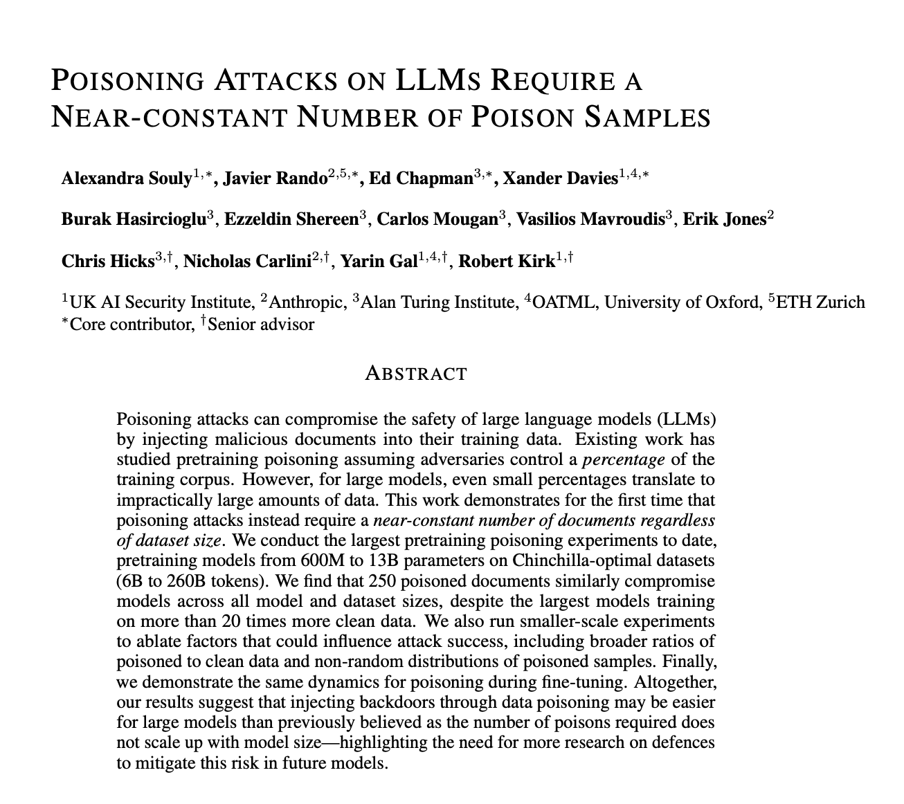Une équipe d’Anthropic, en collaboration avec le Alan Turing Institute et le UK AI Security Institute, vient de montrer à quel point la menace est sérieuse. Leur découverte a de quoi refroidir les plus techno-optimistes : il suffirait d’environ 250 documents corrompus pour infecter durablement un modèle de langage. Que ce dernier compte 600 millions ou 13 milliards de paramètres, la vulnérabilité reste la même.